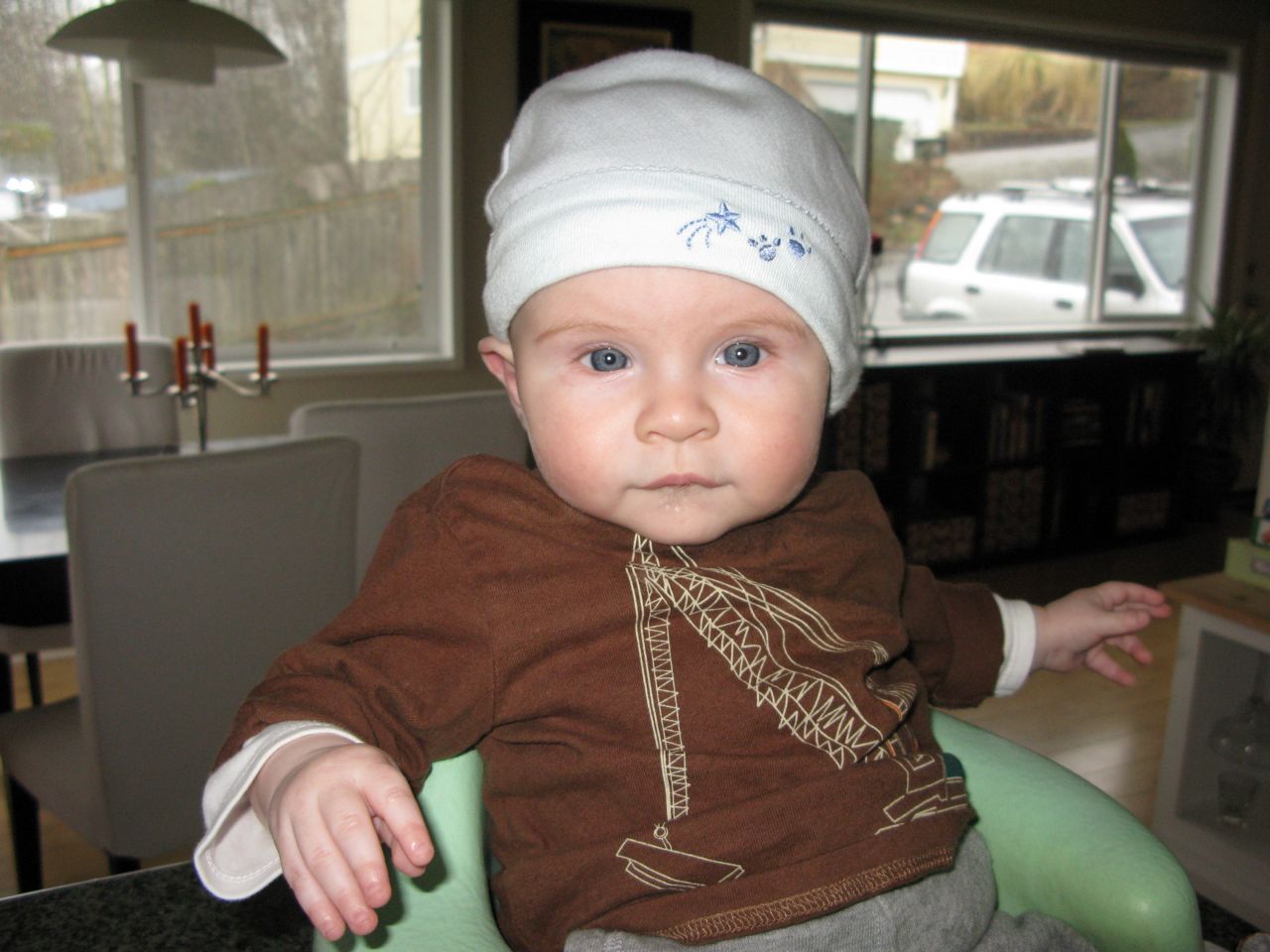 Four months old. I remember taking this picture and thinking he looked good in the hat because he was still completely bald.