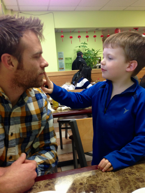 Then he walks all the way back around the table to Jason’s side where he proceeds to anoint him with the same sticky-handed blessing. Then on to Gryffin. And don’t forget the dog. Mr. Bates gets a blessing, too, before he leisurely returns to his chair and proudly pronounces the AMEN!